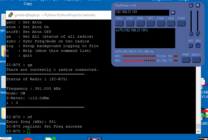gm4slv@laptop:~/Python/PythonProjects/netradio $ python2 client.py There are currently 1 radios connected. ================================= Status of Radio 1 (IC-R75) Frequency : 391.000 kHz Mode: CW S-Meter: -113.0dBm 1 : 0 ================================= Please choose a radio There are currently 1 radios connected. Radio 1 is IC-R75 Choose a radio number from the list : 1 The available commands are: lr : List Radios sr : Select the Radio to control gr : Get currently selected Radio name gm : Get Mode sm : Set Mode gf : Get Freq sf : Set Freq gs : Get S-meter gp : Get Pre-amp pon : Set Pre-amp On poff : Set Pre-amp Off gatt : Get Attn aton : Set Attn On atoff: Set Attn Off ga : Get All (status of all radios) sync : Sync freq/mode on two radios log : Setup background logging to file h : Help (show this command list) q : quit IC-R75 >